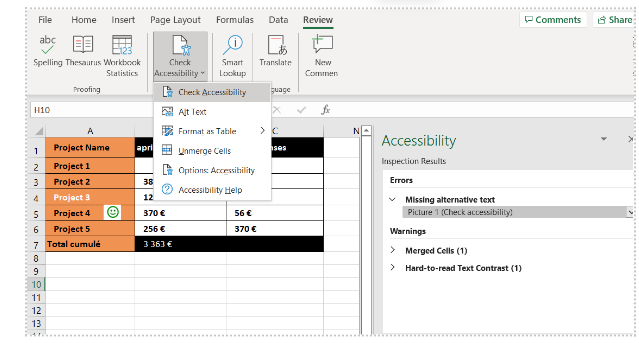 - Use the integrated accessibility checker : Menu "Review" > "Check accessibility"