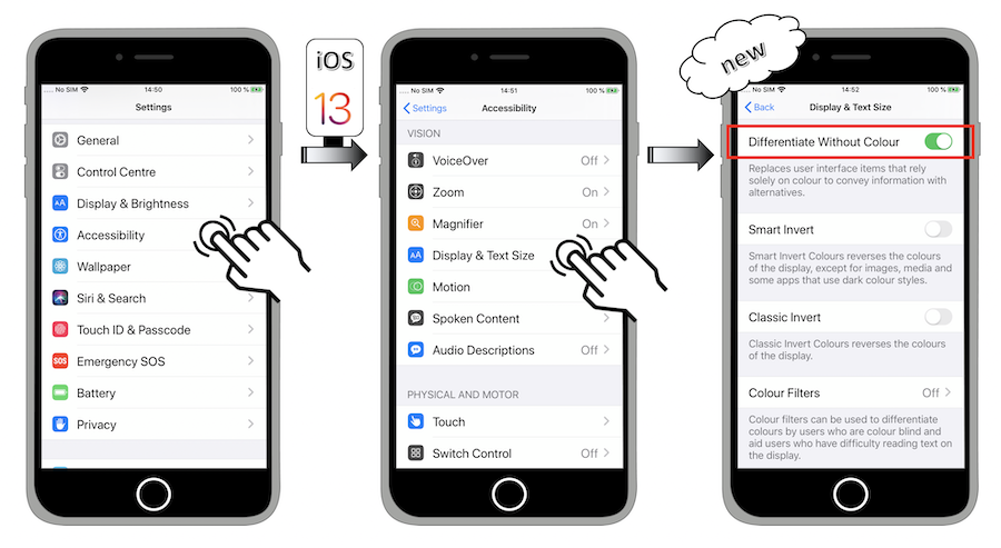 The Differentiate Without Color iOS 13 new feature is a user setting that indicates the will of having visual information not passed on by colors.