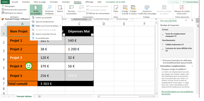 - Utiliser le vérificateur d’accessibilité proposé par Excel Menu Révision > vérifier l’accessibilité