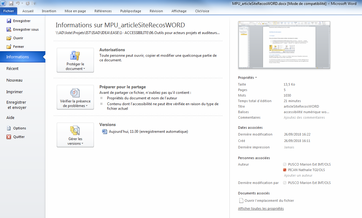 Ces informations accessibles à tous via un clic dans Windows sur un fichier (affichage dans la partie basse de la fenêtre de dialogue) ou via un clic droit dans Propriétés, sont aussi lues par un lecteur d’écran.
