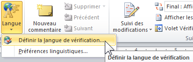Signaler tout changement de langue ponctuel en sélectionnant le groupe de mots concerné puis Révision > Langue > Définir la langue de vérification.