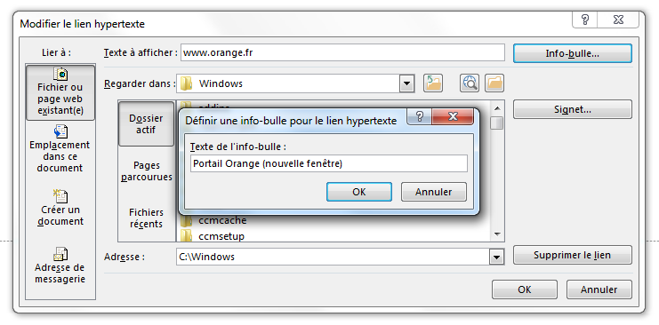 • menu Insertion > Lien hypertexte > Info-bulle : ajouter « nouvelle fenêtre » dans le libellé