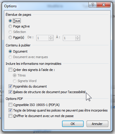 La case à cocher « Balises de structure de document pour l’accessibilité » doit être cochée.