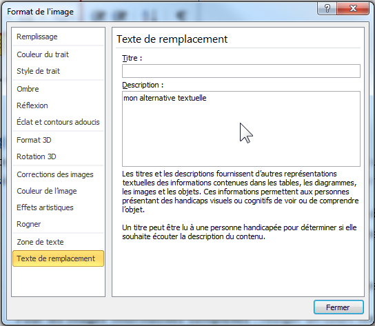 • Pour les images porteuses d’informations : renseigner un texte de remplacement qui reprend le contenu informatif de l’image : clic droit > Format de l’image > Texte de remplacement > champ « Description ».