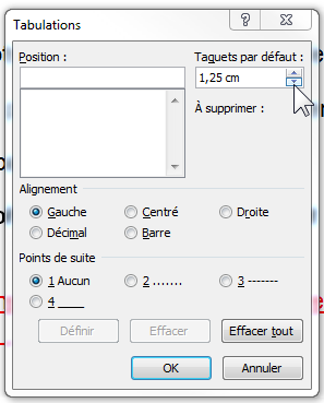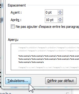 Remarque : le menu « Tabulations… » accessible dans la fenêtre « Paragraphe » permet d’ajuster la taille des tabulations (ajuste « Taquets par défaut ») :