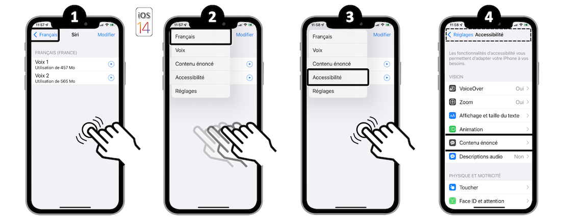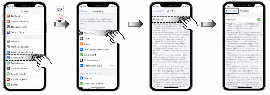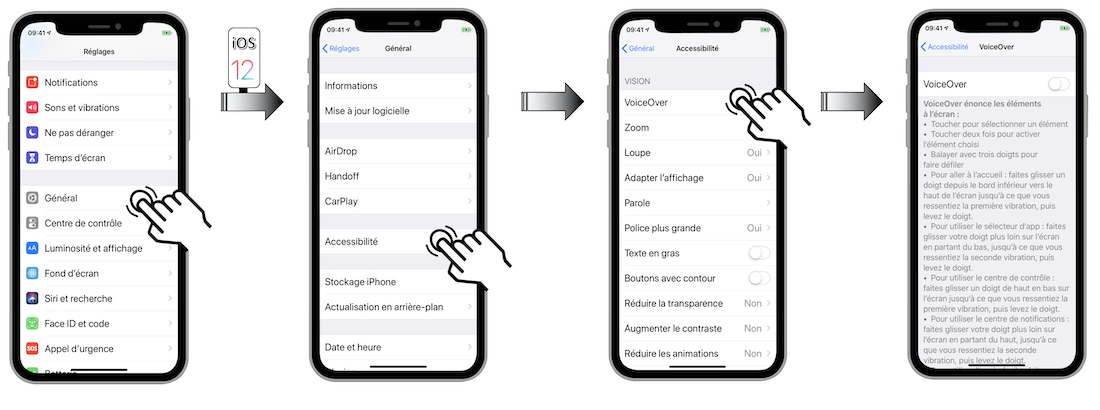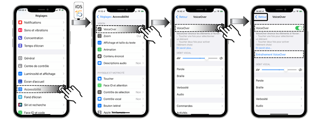 VoiceOver est le lecteur d’écran natif iOS qui décrit à haute voix les éléments qui apparaissent sur l’écran de votre terminal.