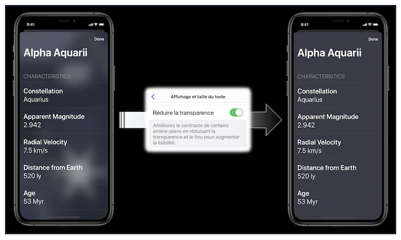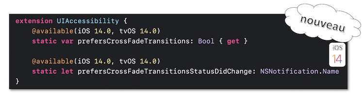 La seconde, introduite en iOS 13, permet un passage entre les différents écrans moins perturbant pour certains utilisateurs dont l'adaption visuelle aux mouvements est particulièrement sensible (🎬 13:31).